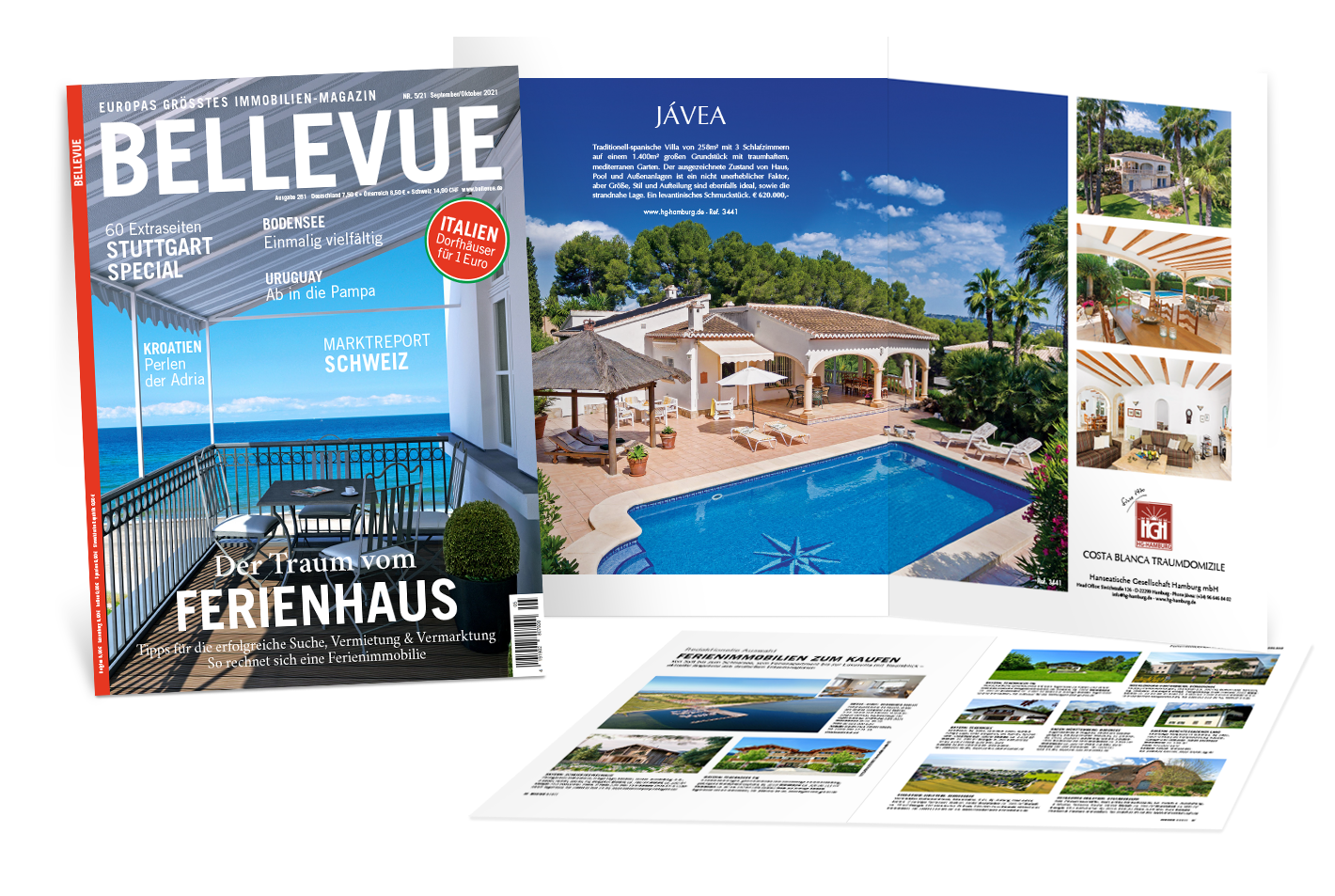 Produziert im Auftrag der BELLEVUE Media GmbH. Über das Redaktionssystem vjoon K4 und mit Hilfe von umfangreichen Workflows entsteht Europas größtes Immobilienmagazin. Wir bearbeiten die Bilder, erstellen Druckdaten, Digitalproofs und die Web-PDFs. Alle zwei Monate erwarten Sie in BELLEVUE die schönsten Kaufimmobilien Deutschlands und europaweit, Angebote in unterschiedlichen Preiskategorien, besondere Schnäppchen, wertvolle Tipps zum Hauskauf und vieles mehr.